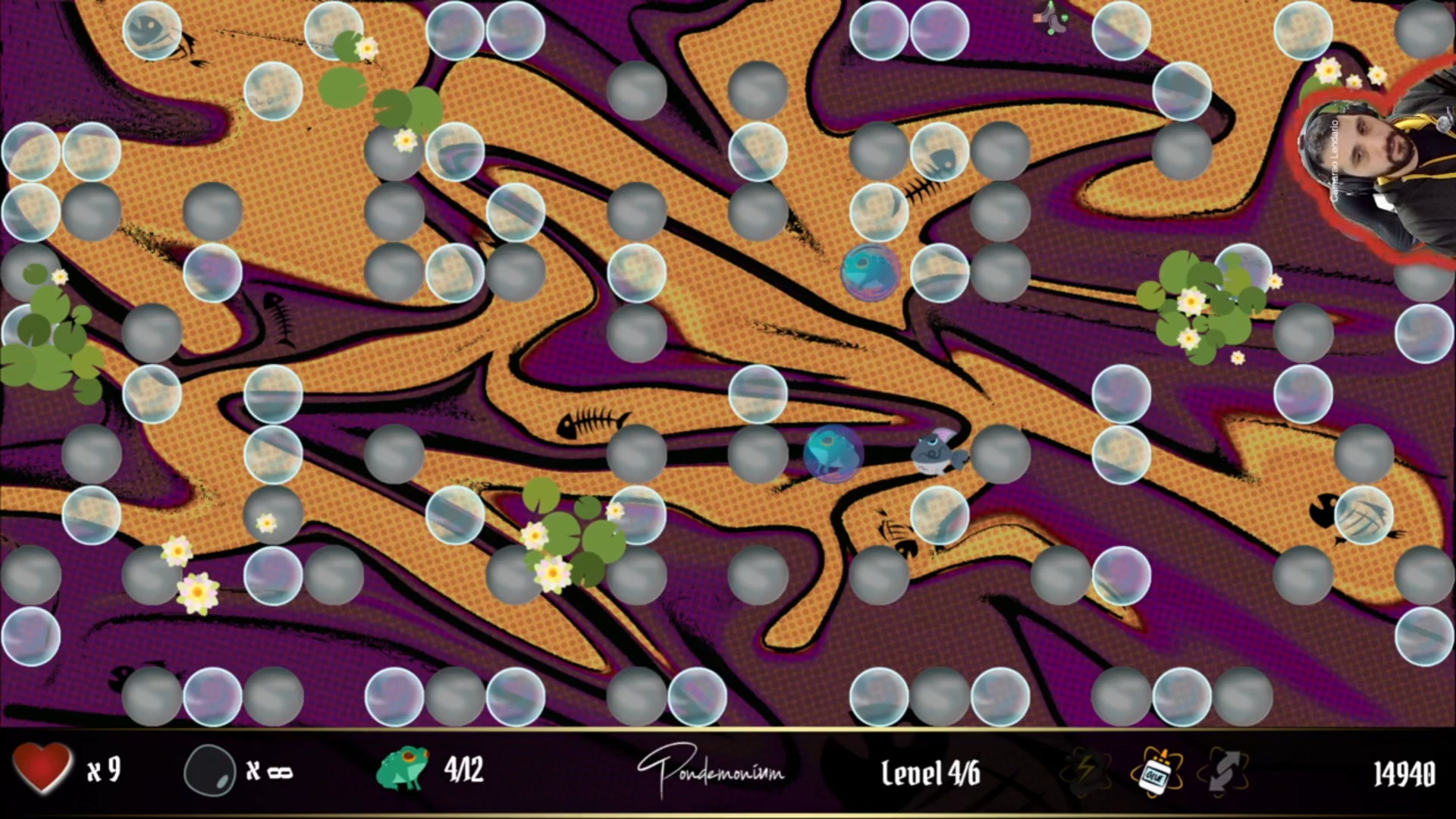 In Pondemonium, you control Charlie, a quirky catfish, who is rampaging through a maze-like pond, blasting frogs, dodging bullets of pure frog spit (nasty!!!), and turning the wetlands into a warzone. Inspired by Battle City, but slimier, sillier, and significantly more aquatic.